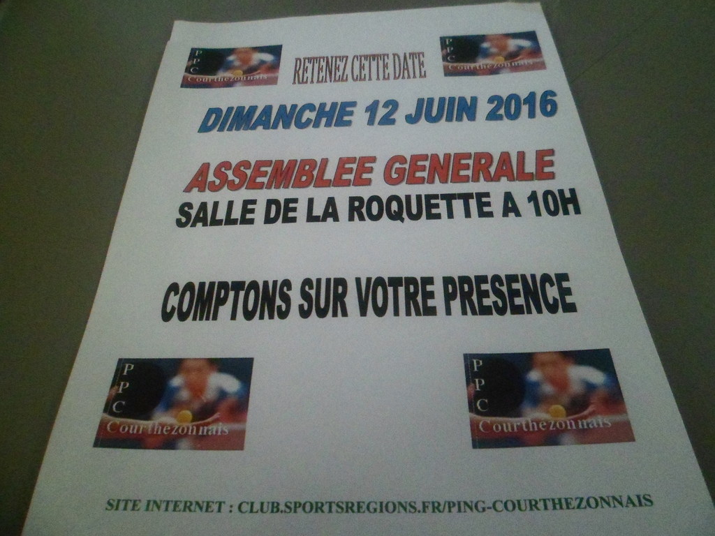 Le Ping Pong Club Courthézonnais vous informe que l' Assemblée Générale du Club se déroulera le DIMANCHE 12 JUIN 2016 à la Salle de la Roquette à 10h00.