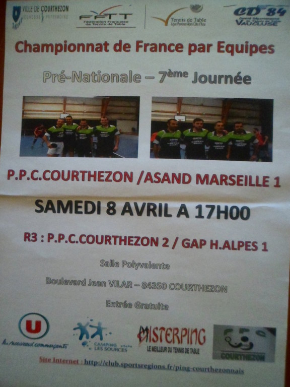 Pour ce dernier tour du championnat régional par équipes séniors, les hommes de PN et R3 chers au Président Roger MARCHETTI joueront leur rencontre à domicile, c'est à dire à la salle polyvalente de COURTHEZON.