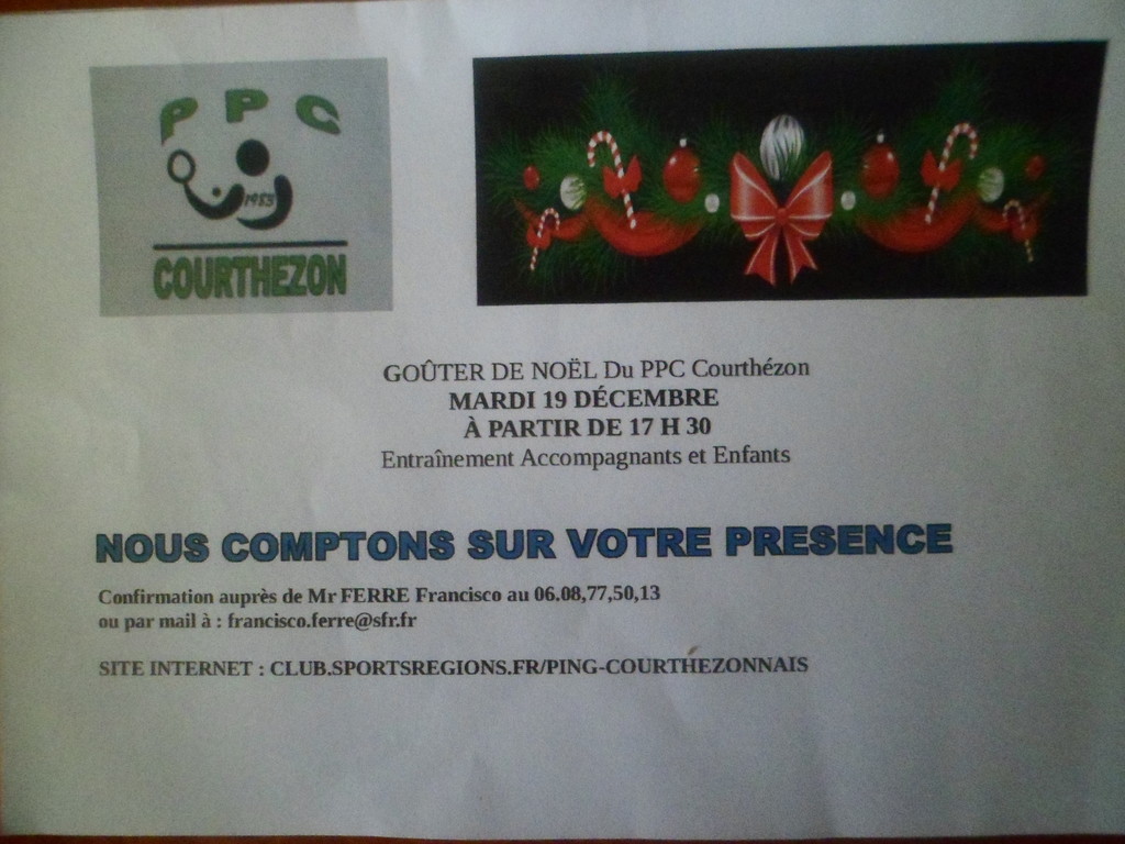 Ce mardi 19 Décembre 2017 avant dernier entraînement de l'année pour les jeunes, le P.P.C.C organisera son GOUTER DE NOEL à la salle polyvalente à partir de 17h30.
