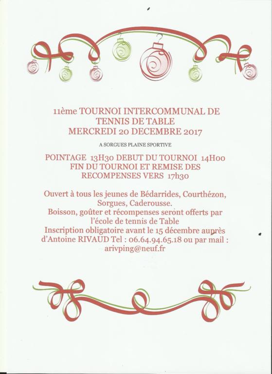 Le mercredi 20 Décembre aura lieu le 11ème tournoi intercommuinal jeunes à SORGUES dirigé par de Antoine RIVAUD.