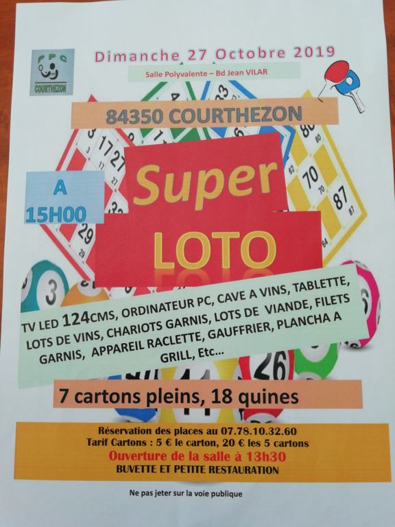 Amis pongistes et amateurs de loto, le Ping Pong Club Courthézonnais organise ce DIMANCHE 27 OCTOBRE 2019